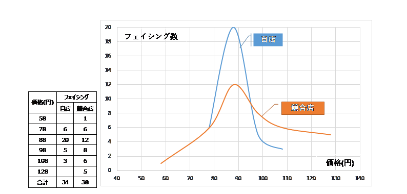 自店と競争店の同一品種の中で品目ごとの価格ラインとフェイシング数を調査し、一つのグラフにまとめて比較するもの。